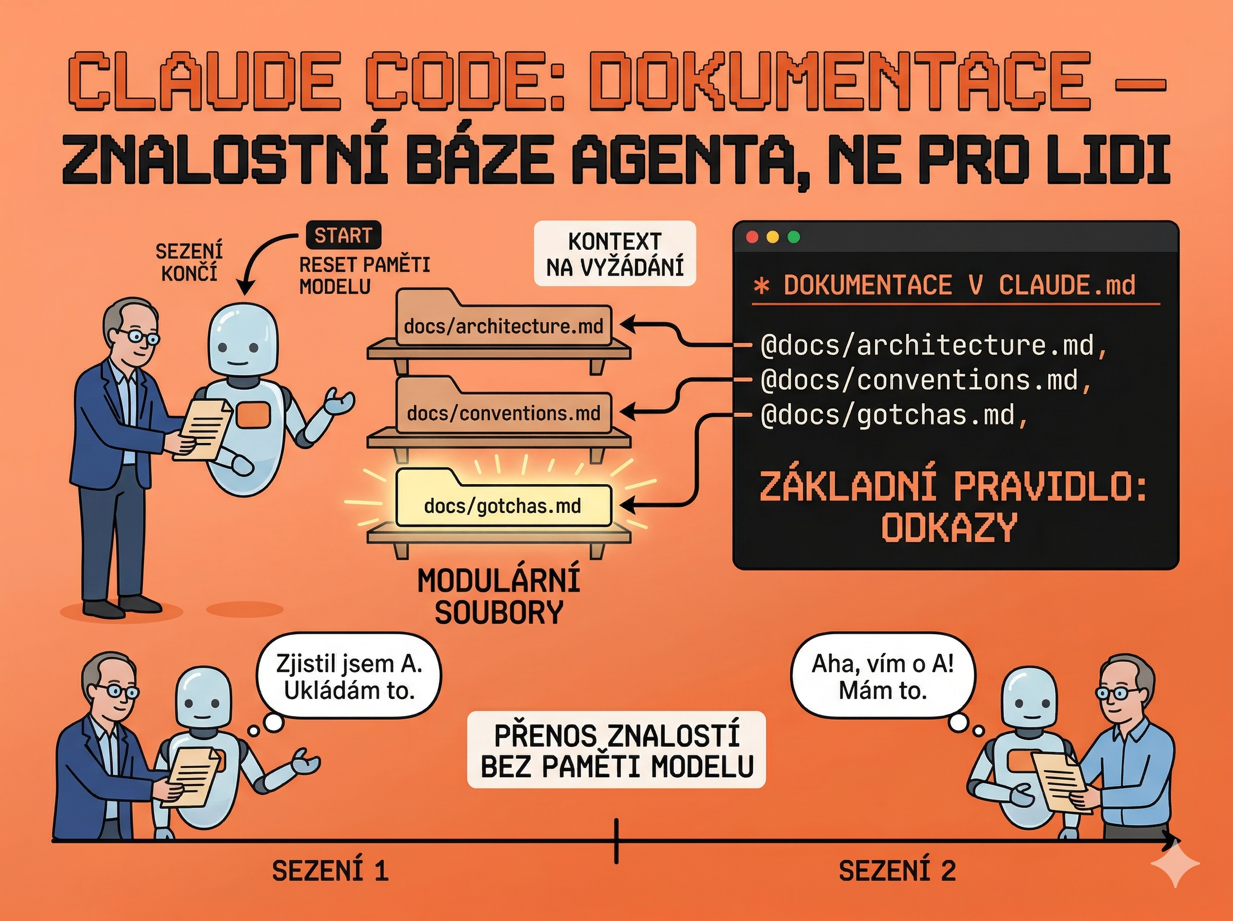 Toto je přímá odpověď na jeden ze základních problémů Claude Code: každé sezení začíná bez paměti předchozích. Více praktických tipů, jak z Claude Code vytěžit maximum, najdete v přehledu insights. Dobře udržovaná docs/ složka tento problém z velké části řeší — ne přes paměť modelu, ale přes explicitní znalostní bázi v repozitáři.